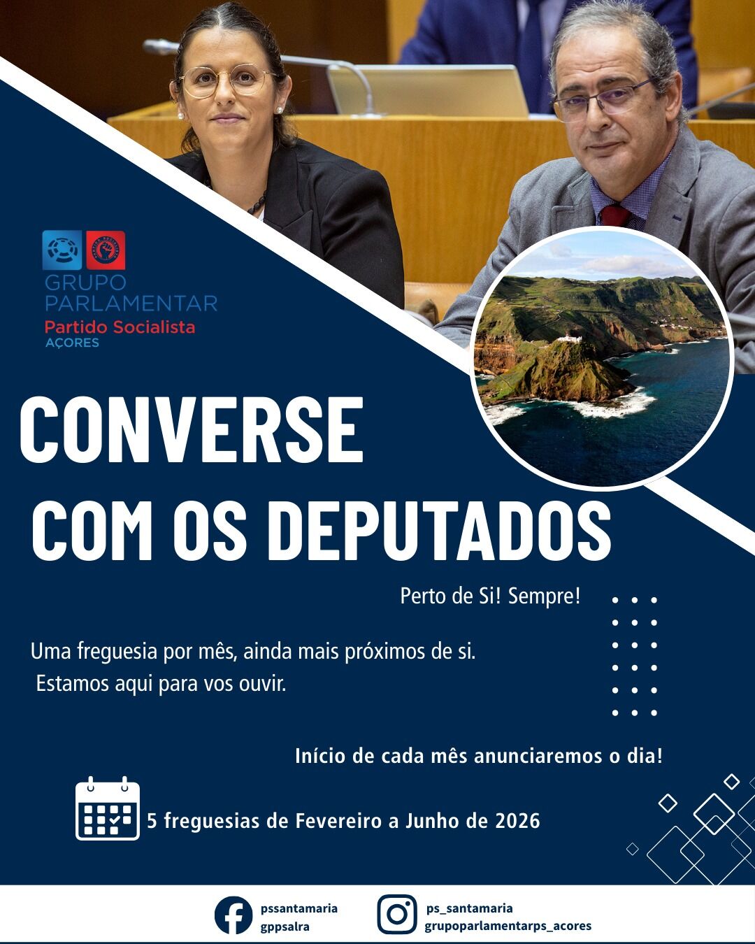 Os deputados do Partido Socialista eleitos pela ilha de Santa Maria vão promover, ao longo dos próximos meses, a iniciativa “Converse com os Deputados”, um ciclo de dias abertos em várias freguesias daquela ilha, com o objetivo de reforçar a proximidade com a população e ouvir diretamente as suas preocupações, sugestões e expectativas.